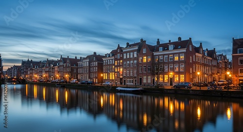 holland, holland, europa, city, city landscape, urban, canal, water, building, architecture, house, residence, facades, gabled, street, waterfront, evening, night, dusk, twilight, sunset, moody, tranquil, serene, peaceful, calm, romantic, cosy, charming, picturesque, scenic, light, sky, cloud, window, street light, car, boat, bicycle, tree, roof, chimney, bridge, blue, orange, gold