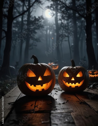 Glowing Halloween pumpkins casting eerie shadows on wooden surface in dark forest, dark, mystery, night