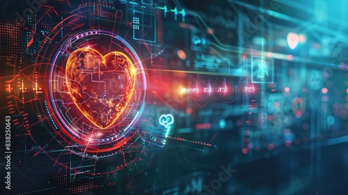 Glowing heart wave with digital tech symbols, highlighting the fusion of healthcare and technology, on a dark backdrop