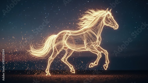 horse, glowing, aethereal, night, star, running, silhouette, light, dark, energy, dynamic, freedom, celestial, majestic, spirited, animal, artwork, fantasy, digital, magical, movement, wild, grace, elegance, speed, brilliance, sparkle, dust, particle, cosmic, universe, dreamlike, abstract, creature, form, outline, gold, vibrant, motion, powerful, alive, illuminated, equine, starry, mystical, divine, beauty, flowing, expressive