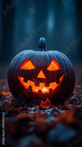 Glowing Jack-O-Lantern Halloween pumpkin in dark spooky atmosphere