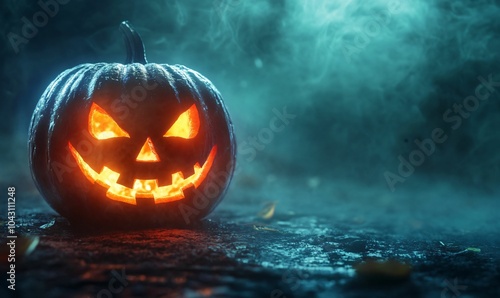 "Glowing jack-o'-lantern in misty fog on Halloween night. Spooky atmosphere for poster or banner design."