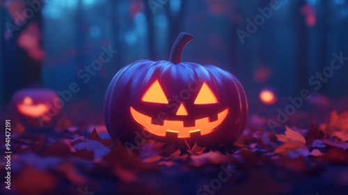 Glowing Jack-o'-Lantern Pumpkins in a Rainy, Fog-Laden Forest Setting, Casting an Eerie Light Over the Wet Leaves and Creating a Chilling Halloween Atmosphere
