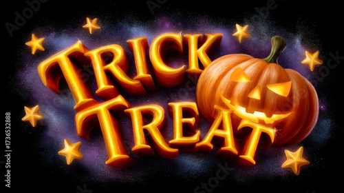 Glowing Jack-O-Lantern with Carved Face and Trick or Treat Text Surrounded by Stars