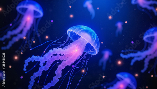 Glowing jellyfish drifting through a bioluminescent ocean, surreal beauty
