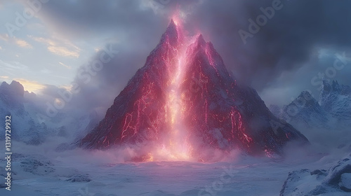 mountain, peak, lava, volcano, snow, ice, fire, winter, landscape, nature, scenery, dramatic, light, glow, cold, hot, contrast, surreal, fantasy, art, digital, artwork, majestic, impressive, powerful, beautiful, amazing, breathtaking, stunning, spectacular, vibrant, intense, energy, power, mystery, wonder, magical, unique, extraordinary, remarkable, incredible, sublime, gorgeous, grand