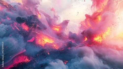 lava, volcano, eruption, fire, smoke, heat, hot, fiery, magma, rock, texture, abstract, art, design, fantasy, surreal, vibrant, colourful, energy, power, intense, bright, light, glow, cloud, steam, ash, dust, landscape, scene, background, illustration, digital, painting, graphic, image, picture, photo, nature, geology, element, dramatic, awe, wonder, majestic, sublime