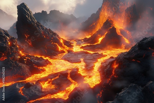 Glowing lava streaming past jagged rock formations under misty, heated air