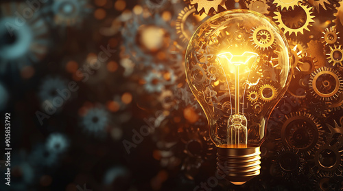 Glowing light bulb and cogwheel gears illustration background. Engineering mechanism settings, copy space, intelligence and creativity power