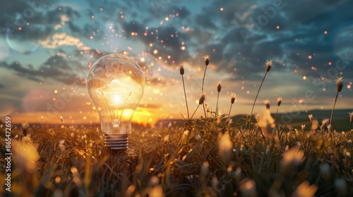 glowing light bulb on a background of nature, field and plants. concept of energy conservation, environmental friendliness