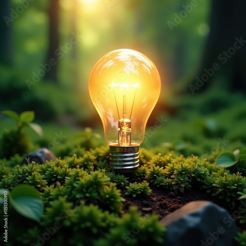 Glowing light bulb surrounded by vibrant greenery, casting soft warm glow on natural terrain, artistic ambiance, , creative inspiration