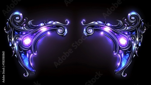 wing, metallic, glowing, intricate, design, purple, blue, dark, swirl, fantasy, ornate, abstract, art, graphic, illustration, digital, elegant, shimmer, shine, light, energy, power, mystical, magical, aethereal, cosmic, space, galaxy, chrome, silver, steel, decoration, frame, border, emblem, symbol, pattern, texture, background, vibrant, captivating