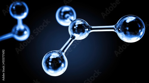 molecular, atom, bond, science, chemistry, physics, three-dimensional, rendering, illustration, graphic, design, transparent, glassy, sphere, blue, glow, dark, background, abstract, structure, connection, network, element, particle, orbital, electron, proton, neutron, nucleus, research, discovery, technology, innovation, microscopic, nano, scale, detail, visual, aesthetic, artistic