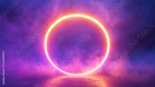Glowing Neon Circle in Fog Futuristic Abstract Background with Pink and Purple Hues.
