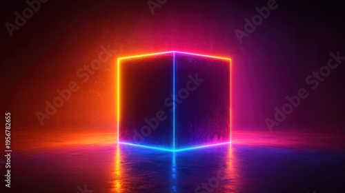 glowing neon cube with blue, pink and orange illuminated edges reflected on a dark wet floor, futuristic and mysterious atmosphere