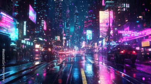 Glowing neon cyberpunk city street view with abstract digital rain effects, vibrant holograms and futuristic city atmosphere, background wallpaper AI generated image
