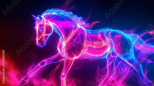 horse, fire, pink, blue, purple, neon, light, energy, abstract, animal, magic, fantasy, mythical, powerful, speed, dynamic, fiery, glowing, bright, colourful, vibrant, sparkling, artistic, creative, digital, art, illustration, graphic, design, modern, contemporary, painting, futuristic, mystical, enchanting, intense, passionate, dramatic, night, dark, smoke, particle, movement, motion