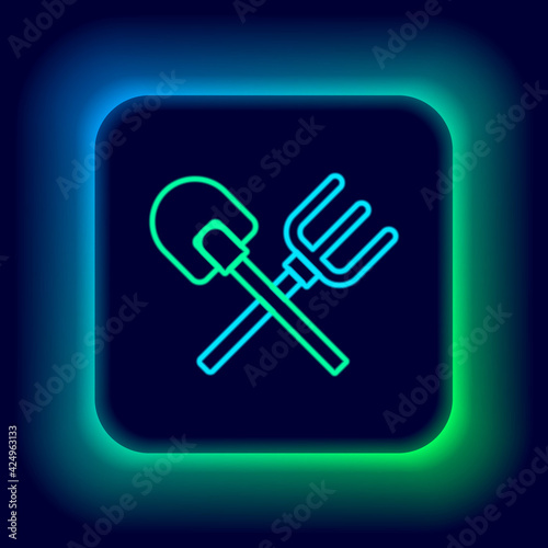 Glowing neon line Shovel and rake icon isolated on black background. Tool for horticulture, agriculture, gardening, farming. Ground cultivator. Colorful outline concept. Vector