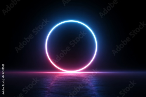 Glowing Neon Pink and Blue Circle on Dark Reflective Surface