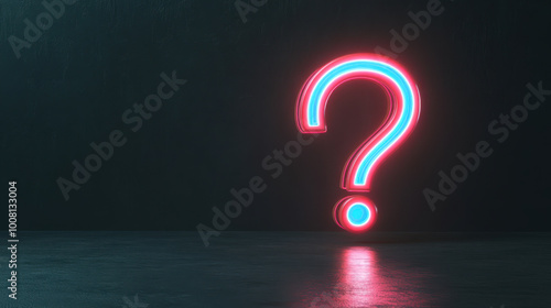 glowing neon question mark stands out brightly against dark background, creating striking visual contrast. This evokes curiosity and intrigue