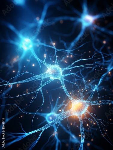 nerve cell, synapses, brain, science, technology, digital, abstract, glowing, blue, orange, light, connection, communication, electricity, energy, futuristic, digital artwork, artificial intelligence