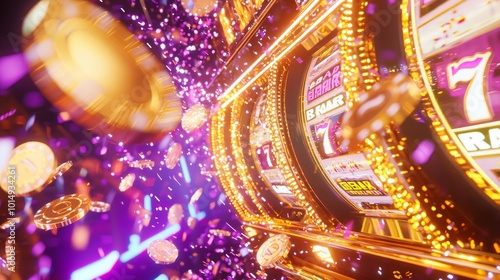 render, online, casino, graphic, design, illuminated, slot, machine, jackpot, glowing, sparkling, coin, festive, confetti, explosion, digital, art, gambling, concept, virtual, gaming, entertainment, colourful, bet, winning, fortune, luck, betting, luxury, excitement, cyberspace, vibrant, theme