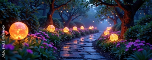 Glowing orbs illuminate a winding garden path, mystical atmosphere, glowing orbs