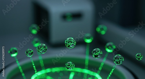 Glowing Orbs Rising with Green Veins Against Machine Backdrop