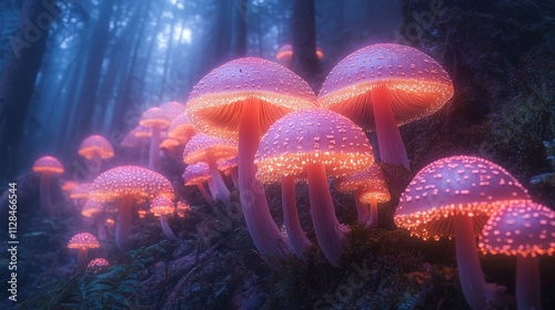 mushroom, forest, pink, glow, light, nature, magical, fantasy, mystical, enchanted, wood, tree, fog, mist, aethereal, dreamy, vibrant, colourful, fungal, cap, stem, spore, gill, flocked, group, scene, background, artwork, digital, art, illustration, image, photo, picture, fairy tale, luminescent, dark, night, twilight, mysterious, serene, peaceful, wonderland, ambience, atmosphere