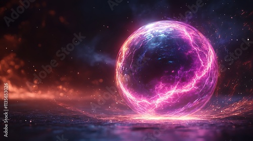 Glowing plasma sphere purple and blue light rays dark background static energy discharge quantum science