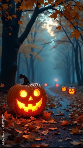 Glowing pumpkin among autumn leaves in mystical forest environment. Halloween concept