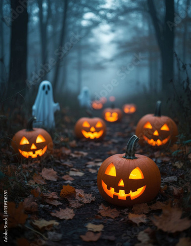 glowing, pumpkin, forest, ghost, halloween, eerie, skittish, haunted, supernatural, mystical, sinister, festive, celebration, candle, flames, carved, grinning, scarey, magical, ominous, aglow, mysterious, creepy, ghostly, dark, night, autumn, tree, fog, folklore, tradition, digital, enchanting, horror, fantasy, atmospheric, chilling, thrilling, spine-chilling, paranormal, shadow