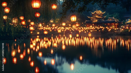 Glowing red and gold lanterns illuminating a calm lake during a lantern festival creating a beautiful water reflection