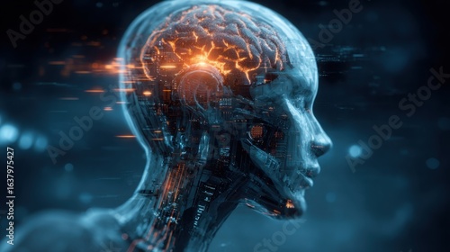 robot, head, artificial, intelligence, ai, brain, digital, technology, futuristic, cyborg, glowing, neon, light, circuit, board, machine, learning, neural, network, android, android, science, fiction, innovation, progress, computer, datum, processing, energy, power, abstract, concept, design, background, blue, orange, spark, future, thinking, mind, system, computing, electronic, mechanism
