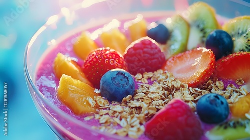 Glowing smoothie bowl with vibrant fruits and granola, healthy and delicious, sleek and dynamic