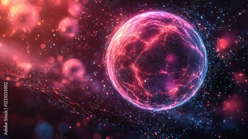 sphere, globe, network, digital, art, abstract, design, glowing, light, connection, point, line, energy, cosmic, nebula, space, universe, technology, futuristic, modern, science, innovation, datum, information, communication, cyberspace, web, virtual, reality, particle, pixel, vibrant, pink, red, blue, dark, background, illustration, graphic, concept, creative