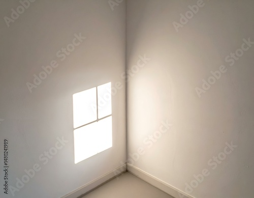 Glowing square window in a white corner. Minimalist interior design. Bright light source.