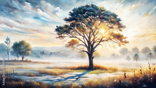 Glowing tree in vibrant landscape at sunrise, surrounded by misty grass and soft hills, foggy morning