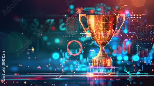 glowing trophy surrounded by digital elements and vibrant colors symbolizes achievement and success in modern, tech inspired environment