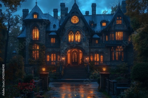 Glowing victorian gothic castle illuminating a rainy night, creating a mysterious and enchanting atmosphere