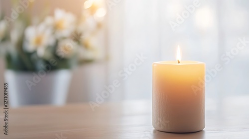 Glowing white candle on a wooden table with beautiful flowers and soft light creating a serene atmosphere : Generative AI