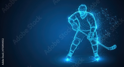 hockey, digital, futuristic, player, technology, sport, blue, neon, wireframe, glowing, virtual, athlete, action, plexus, network, energy, ice, skater, polygonal, abstract, graphic, illustration, motion, speed, power, light, aglow, stick, skate, game, competition, line, dot, connection, hologram, datum, winter, team, championship, dynamic, electric, professional, particle, background, grid, cyber, stance, rink