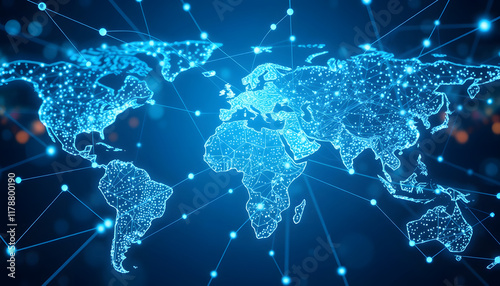 Glowing World Map with Network Connections: Global Communication