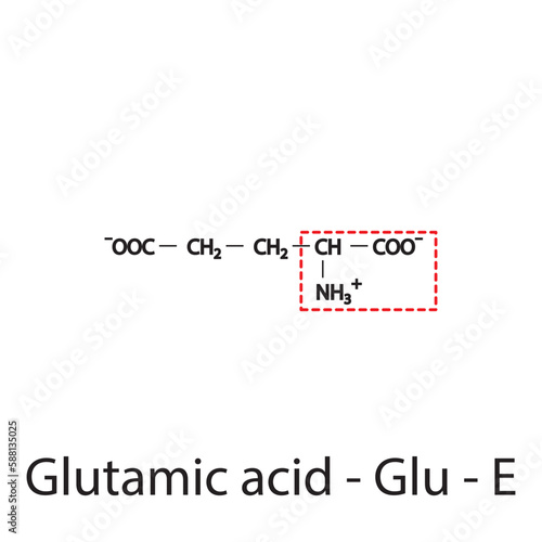 Glutamic acid - Glu - E amino acid structure. Skeletal formula with amino group highlighted in red frame. Scientific illustration.