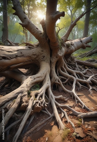 Gnarled tree roots twisting around a fallen log, natural, wilderness, roots