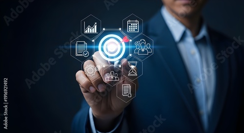 Goal setting and strategic focus using digital interface. businessman selecting target icon and strategy dashboard. strategic planning, performance tracking and digital business management for success