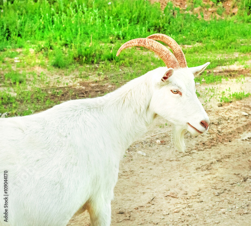 animal, farm, white, goat, nature, mammal, grass, head, pet, meadow, agriculture, milk, green, view, horizontal, life, 1, pasture, outdoors, rural, concept, photo, in, organic, summer, lifestyle, healthy, farm animal, beauty, vertebrate, idea