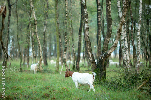 Goats browsing and foraging in grassland meadow heather moorland landscape with birch trees and forest