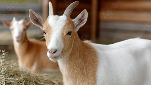 Goats eagerly eating hay in an exhibition hall during a lively agricultural event captured with captivating detail