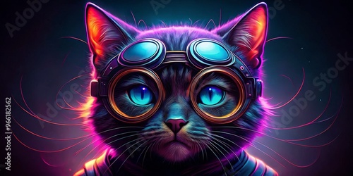 Goggles and Glow A Cat's Neon Portrait, digital art, cat, neon, goggles,
